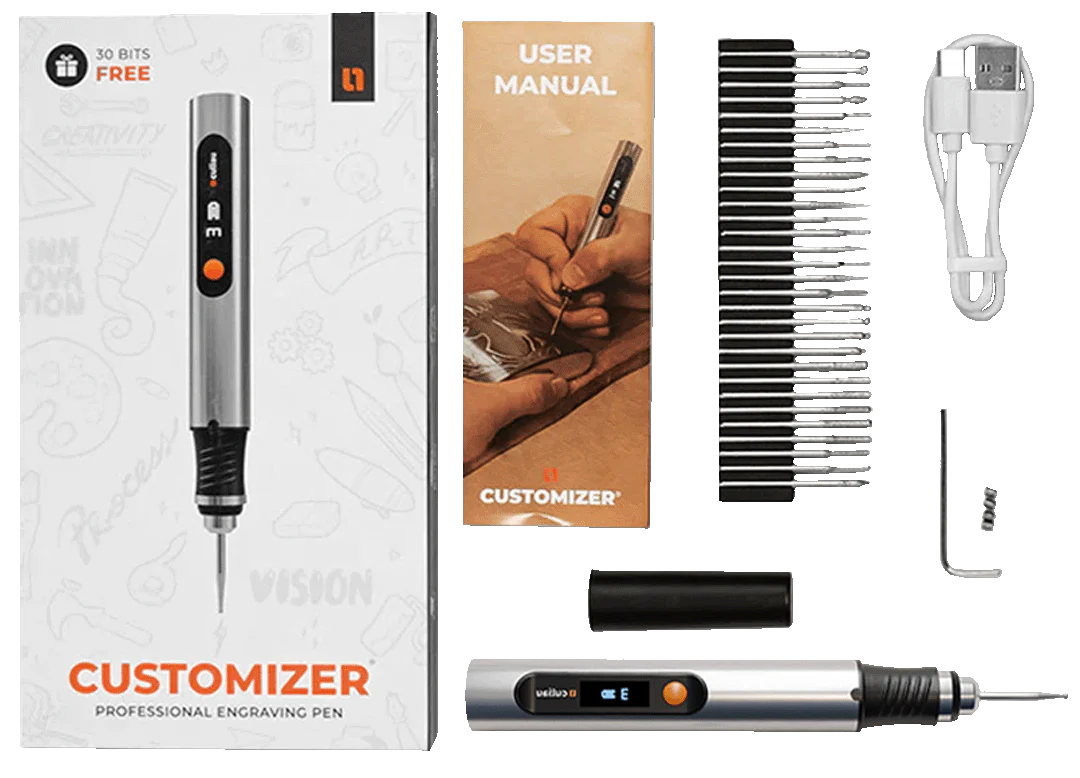 Customizer Pen ile dilediğiniz yüzeyi kolayca kişiselleştirin.Ahşap, cam, taş veya metal fark etmeksizin.